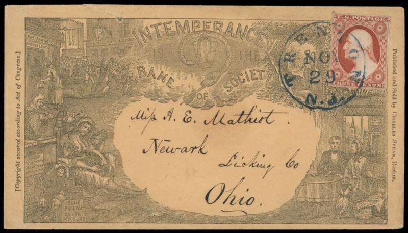 (Propaganda) Intemperance Is the Bane of Society. Overall propaganda design with numerous scenes including a serpent emerging from a whiskey glass, Charles Spear of Boston imprint at right, on buff cover bearing 3¢ dull red (11A), four margins all around, tied by clear strike of blue "Trenton N.J. Nov 29" cds to Newark, Ohio; small cover tear at top left, 3¢ small erosion spot, Very Fine appearance. Estimate; $300 - 400. US$300-400 (Image)