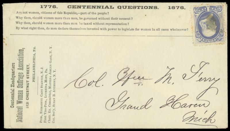 (1876 Philadelphia) Centennial Headquarters, National Woman Suffrage Association, Philadelphia Pa. Advertising on unsealed cover bearing 1¢ ultramarine (156) tied by cork cancel addressed to Col. Wm. M. Ferry, Grand Haven, Mich., ad lists President Elizabeth Stanton and Cor. Secretary Susan B. Anthony; small upper left cover tear, otherwise Very Fine and scarce Woman Suffrage advertising. Estimate; $200 - 300.