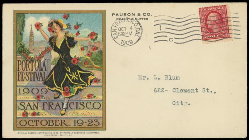 (Fairs) 1909 Portola Festival, San Francisco. Multicolor porster illustration, additional imprint of Pauson & Company men's wear store on cover bearing 2¢ carmine tied by "San Francisco Cal. Oct 4, 1909" machine cancel to local city street address, Extremely Fine and stunning design. Estimate; $500 - 750. US$500-750 (Image)