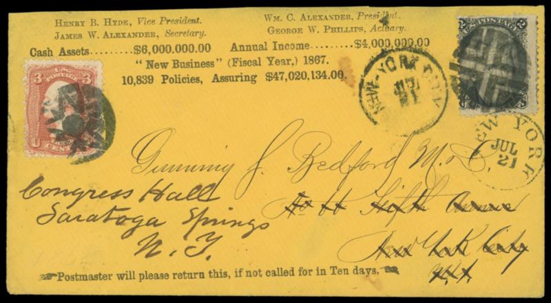 Elaborate Geometric. Bold strike duplexed with "New-York City, Jul 21" cds ties 2¢ black, E. grill (87) on orange buff insurance company advertising cover to local New York City street address, forwarded to Saratoga Springs N.Y. with 3¢ red, F. grill (94) tied by bold Elaborate Star (ST-E 30) cancel, additional "New York, Jul 21" cds at right; reduced slightly at top, Very Fine and unusual forwarded use with two different New York fancy cancels. Skinner-Eno No. GE-E 87; Estimate $300 - 400. US$300-400 (Image)