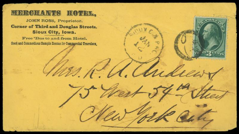 Man's Profile in Circle. Sharp complete strike ties 3¢ green (158), rich color and nicely centered, matching "Sioux. & Pac. R.P.O. Jan 12" railroad cds on orange Merchants Hotel, Sioux City, Iowa corner card cover to New York City, Jan. 15th arrival backstamp; long cover tear, an Extremely Fine strike, with 1984 (copy) and 2017 P.F. certificates. Cole No. JO-141; Estimate $300 - 400. US$300-400 (Image)