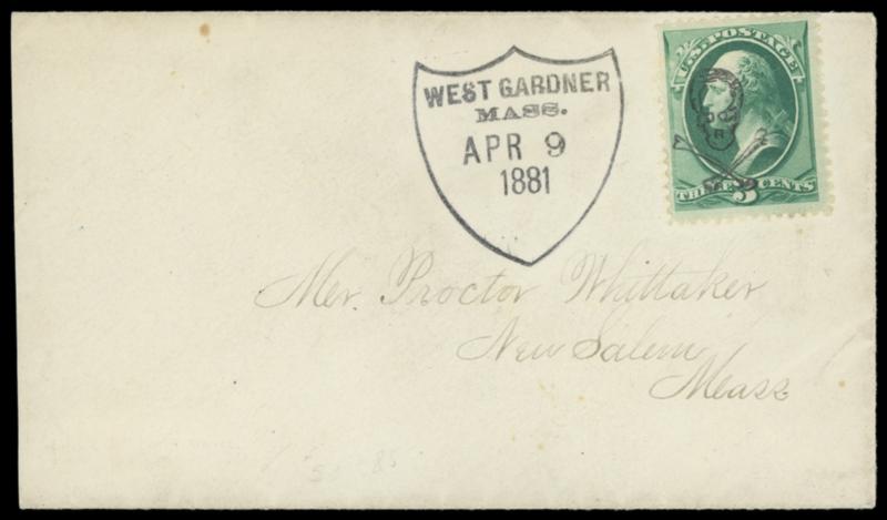Skull & Crossbones. Sharp strike duplexed with "West Gardner Mass. Apr 9, 1881" fancy shield postmark ties 3¢ green (207) on cover to New Salem Mass.; reduced slightly at left, an Extremely Fine gem strike. Cole No. SK-37; Estimate $300 - 400. US$300-400 (Image)