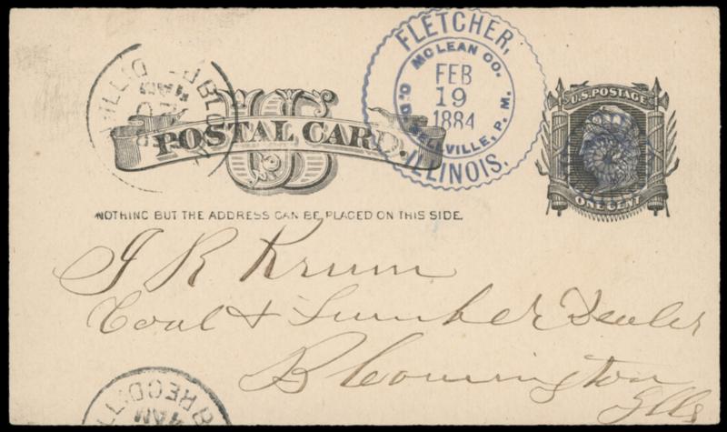 Wheel of Fortune (Fletcher, Illinois). Blackish blue strike duplexed with fancy "Fletcher, Illinois, McLean Co., O.D. Bellville, P.M. Feb 19, 1884" cogged double-circle postmark cancels 1¢ postal card (UX5) ot Blooomington Ill., Feb. 20th arrival cds, Extremely Fine and choice. Cole No. WOF-1; Estimate $200 - 300. US$200-300 (Image)