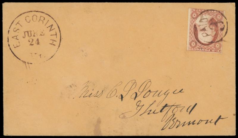 Brown "Paid 3" in Circle. Neat strike ties 3¢ dull red (11A) sheet margin single, large margins to touched, matching "East Corinth Vt. June 24" cds on buff cover to Thetford, Vermont, Very Fine and rare brown strike. Skinner-Eno No. PM-PNc 20 var.; Estimate $200 - 300. US$200-300 (Image)