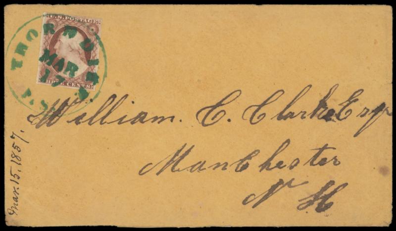 Green "Thorndike Ms. Mar 17" cds. Bold strike ties 3¢ dull red (11), rich color, four full to large margins, on buff cover to Manchester N.H., 1857 docketing at left; bit of flap missing, Very Fine and striking rich green town cds. Estimate; $300 - 400. US$300-400 (Image)