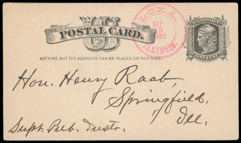 Pink "Loxa, Illinois, Sep 15, 1883". Brilliant pink postmark cancels 1¢ postal card (UX7) to Springfield Ill., Extremely Fine and striking true pink. Estimate; $150 - 200. US$150-200 (Image)
