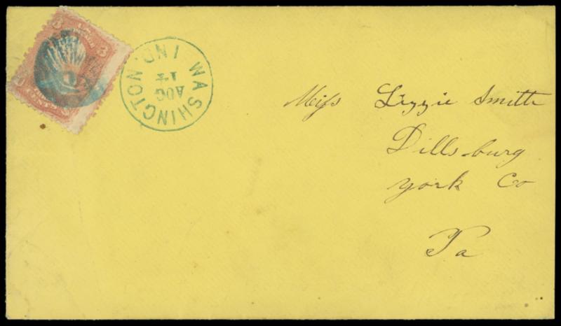 Virtually all known examples of this cancel eminate from this correspondence addressed to Lizzie Smith, Dillsburg, York Co., Pa. Strikes of this cancel with flaws in the Erivan sales realized $5,900 (Sale 7) and $6,490 in (Sale 8). US$1,000-1,500 (Image)