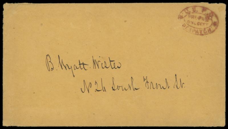 U.S.P.O. Despatch, Pre-Paid, One Cent. Clear strike of red oval handstamp on fresh buff cover with embossed "Penn Mutual Life Insurance Co." flap oval addressed to local Philadelphia street address, with original 1855 life insurance circular, Very Fine and choice,ex-West, Gibson, Lilly, with 2016 P.F. certificate. Estimate; $300 - 400.