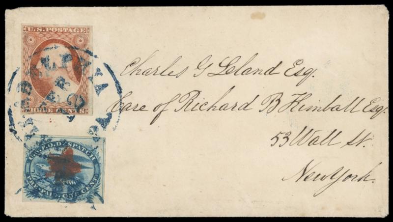 Swart's City Dispatch Post, 1849-53 (2¢) red on blue. Full to huge margins, light pre-use crease, double strike of star cancel, used in combination with 3¢ orange brown (10A) left straddle-line single, huge margins to just clear at bottom, canceled by red circular grid cancel, matching red "U.S. Express Mail, N. York N.Y., 15 Oct" railroad agent cds on blue 1851 folded letter to Boston Mass., endorsed "Please forward with all convenient speed" at lower left, Very Fine and quite attractive, with 1994 (photocopy) and 2025 P.F. certificates. Scott No. 136L6; $850.