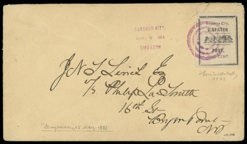Bayonne City Dispatch, 1883, 1¢ black. Full margins, tied by purple target handstamp, matching "Bayonne City, Dispatch, May 16, 1883" three-line datestamp on cover to Bergen Point N.J.; top edge tear, otherwise Very Fine and scarce on cover use, with clear 2016 P.F. certificate. Scott No. 9L1; $750. US$0 (Image)