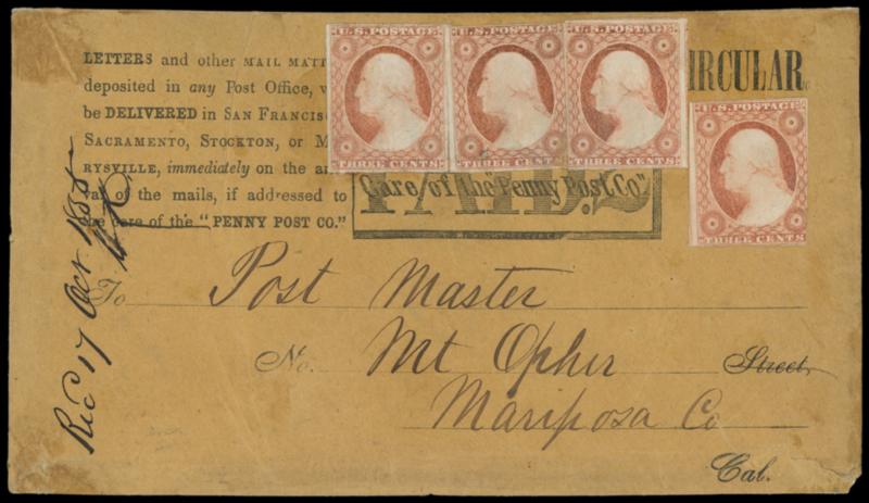 California Penny Post Co., 1855-59, 2¢ black on buff. Printed frank with instructions for users and additional "Circular" at top right, reverse with partial "HELD FOR POSTAGE" in large block letters and "San Francisco Cal. Aug. 23" cds, bearing four uncanceled 3¢ dull red (11A) singles, addressed to the Postmaster, Mt. Ophir, Mariposa Co. Cal.; docketed "Recd 17 Oct 1855" at left; some wear and wrinkles with light left corner stains, right 3¢ moved to show imprint, Fine, with 1976 P.F. certificate. Scott No. 34LU1; $9,000.