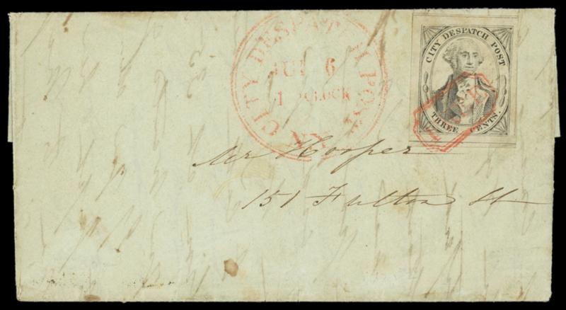 City Despatch Post, 1842, 3¢ black on grayish. Large margins showing outer framelines at top & bottom, tied by red boxed "Free" handstamp, matching "City Despatch Post, N.Y., Jul 6, 1 O'Clock" cds alongside on 1842 folded letter addressed to local New York City street address, Very Fine Greig's City Despatch Post use, with 1991 P.F. certificate. Scott No. 40L1; Estimate $750 - 1,000. US$750-1,000 (Image)