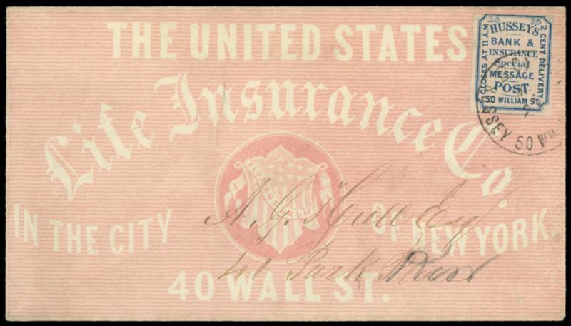 Hussey's Post, 1865, 2¢ blue. Large margins to clear at top, tied by "2 Ct. Paid Hussey 50 Wm. St., Mar 7" circular datestamp (PMC-e) on United States Life Insurance Co. pink lithographed advertising cover to local New York City street address, Extremely Fine and choice,ex-Hall, Mayo. Scott No. 87L38; Estimate $500 - 750. US$500-750 (Image)