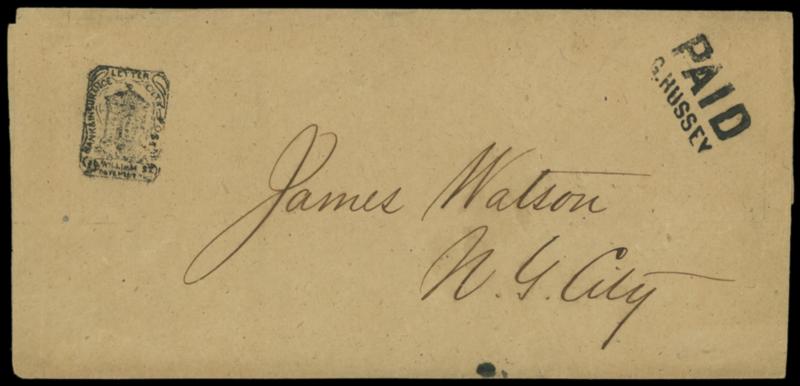 Hussey's Post, 1858, black on manila. Neat strike with intense "Paid/G. Hussey" two-line handstamp (PMS-b) on brown wrapper to local New York City addressee, open at both ends to enclose printed matter, Very Fine and rare, with 2025 P.F. certificate. Scott No. 87LUP2; $600. US$0 (Image)