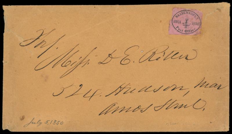 Messenkope's Union Square Post Office, 1849 (2¢) black on pink. Four margins, faulty, uncancelled but tied by extra gum on orange buff cover to New York City street address, partial July, 5, 1850 enclosed letter; two edge tears and edge wear, F.-V.F. appearance,ex-Boker, Erivan, signed Sloane, with 2023 P.F. certificate. Scott No. 106L2; $2,000.