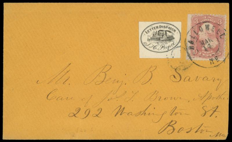 Prince's Letter Dispatch was established by J. H. Prince of Portland Me. and carried mail by steamboat to Boston, Mass. as late as 1869. The pictorial stamps were engraved and printed by Lowell & Brett of Boston, their imprint appears below the steamboat vignette. Only nine or ten complete covers are known according the the Lyons census in the Oct. 2002 Penny Post. US$0 (Image)