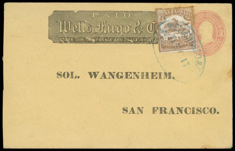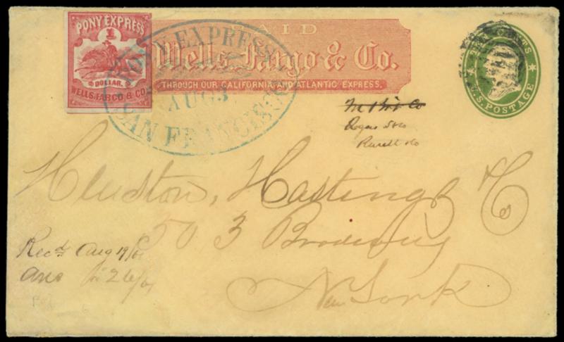 Wells Fargo & Co., 1861, $1 red. Tied by attractive strike of fancy blue "Pony Express, San Francisco, Aug 3" Running Pony oval datestamp on 10¢ green (U33) Star Die buff entire with red Wells Fargo printed frank, canceled by circular grid to New York City, docketed "Recd. Aug 19/61" at lower left; adhesive with small tear, minor cover restoration, Very Fine appearance. Scott No. 143L3; Estimate $7,500 - 10,000.
