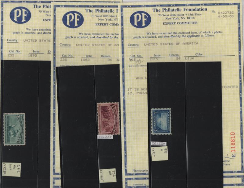 Group (3) unused 1893-1915 all w/ 2005 PF Certs, incl 232 NH (two margin tears), 236 NH, 399 VLH; gen VF to VF-XF (Image)