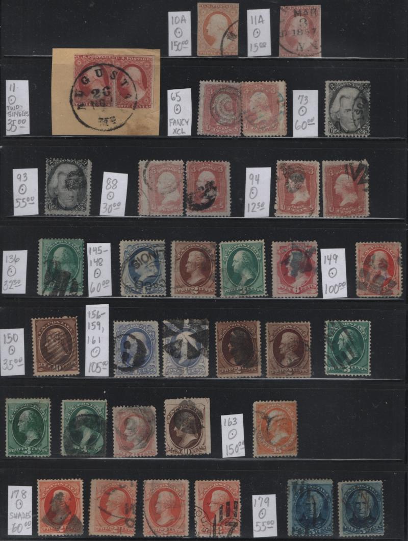 Selection (80) Used Classics on Vario pgs, incl #149, 163, 352, C13, several fancy cancels on Large Banknotes, Schermacks & more; owner IDed w/ CV $2,400 (NV), some typical flts, gen F+ (all shown on web photos) (Image)