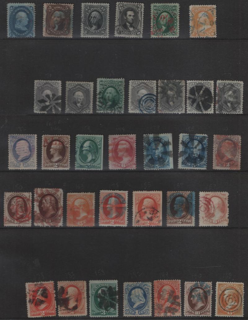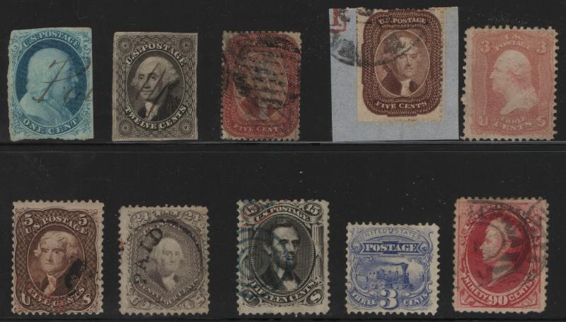 Selection */O (10) diff 19th Cent on approval card, incl used #7, 17, 27 repaired, 29 on piece SE, 70, 76, 77, 191, unused-no gum incl 65, 114; cond mixed, small flts, repairs, to sound, VF to Fine (Image)