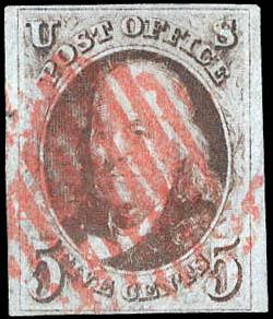 1847, 5¢ Franklin, red brown, dot in "S" variety (Scott 1 var.), 4 ample to large margins, red grid cancel, Very Fine to Extremely Fine, with 2001 P.S.E. certificate. Scott $500. Estimate $250 - 350. (Image)