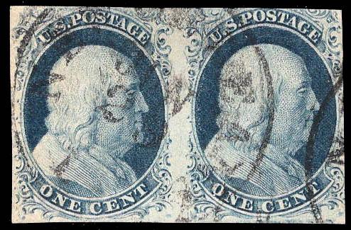 1851, 1¢ Franklin, blue, type II (Scott 7), position 35-36R2, pair, mostly large margins, New Orleans postmark; the left stamp with a tiny thin at bottom, otherwise Fine to Very Fine, with 2026 P.F. certificate. Scott $325. Estimate $100 - 150. (Image)