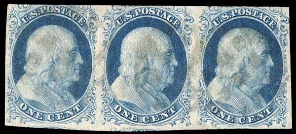 1851, 1¢ Franklin, blue, type II (Scott 7), position 47-49R1E, strip of 3, large margins at bottom to just in at top, light segmented cork cancels, Fine overall, with 2026 P.F. certificate. Scott $500. Estimate $150 - 200. (Image)