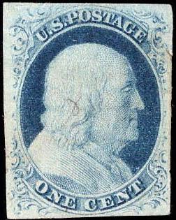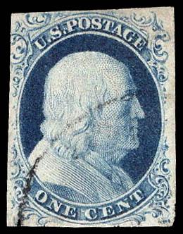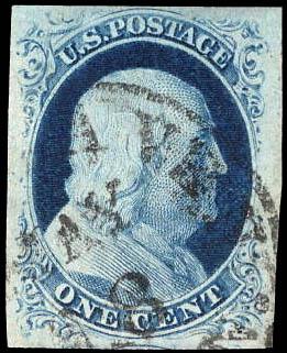 1852, 1¢ Franklin, blue, type IV (Scott 9), large margins all around, a very pretty stamp, light cancel, Extremely Fine. Scott $100. Estimate $100 - 150. (Image)