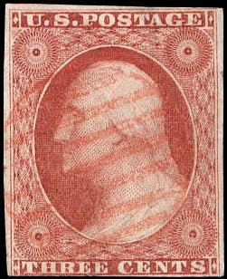 1851, 3¢ Washington, orange brown, type I (Scott 10), 4 margins, grid cancel, Fine to Very Fine. Scott $200. Estimate $75 - 100. (Image)