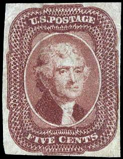 1856, 5¢ Jefferson, red brown (Scott 12), margins all around, faintly canceled, Fine to Very Fine. Scott $750. Estimate $250 - 350. (Image)