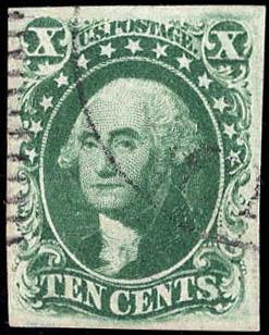 1855, 10¢ Washington, green, type I (Scott 13), large even margins, neat light cancel, Very Fine. Scott $750. Estimate $500 - 750. (Image)