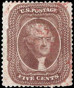 1860, 5¢ Jefferson, brown, type II (Scott 30A), red cancel, Fine. Scott $395. Estimate $120 - 180. (Image)