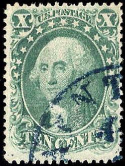 1857, 10¢ Washington, green, type I (Scott 31), attractive centering, blue town cancellation (Saint Louis?); slightly faded by chemical cleaning, otherwise Fine to Very Fine, with 1989 P.F. certificate. Scott $1,230. Estimate $200 - 300. (Image)