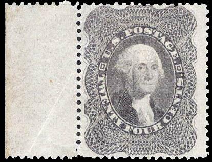 1860, 24¢ Washington, gray (Scott 37a), sheet margin single, o.g., hinged; light diagonal crease in the selvage running through just the top left corner, otherwise Fine to Very Fine. Scott $1,450. Estimate $600 - 800. (Image)