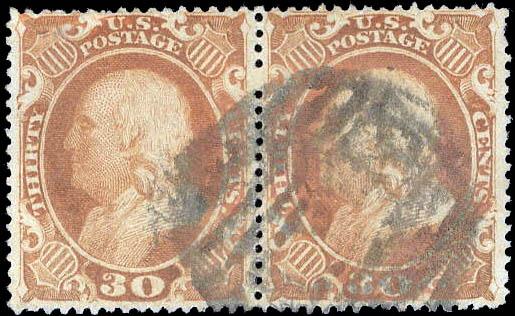 1860, 30¢ Franklin, orange (Scott 38), horizontal pair, Fine to Very Fine. Scott $1,100. Estimate $300 - 400. (Image)