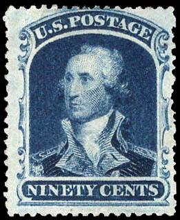 1860, 90¢ Washington, blue (Scott 39), excellent color, unused without gum; a few rough perfs, otherwise Fine. Scott $1,400. Estimate $300 - 400. (Image)