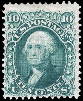 1867, 10¢ Washington, yellow green, F. grill (Scott 96), rich color on bright paper with distinctive grill, o.g., hinged, about Fine, with 1987 P.F. certificate, this issue is quite rare with any kind of decent centering. Scott $2,750. Estimate $500 - 750. (Image)