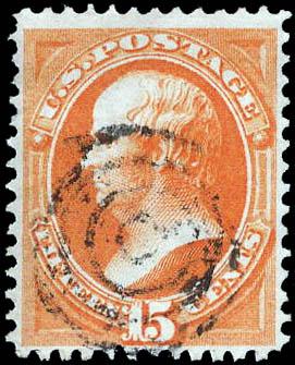 1870, 15¢ Webster, bright orange, without grill, N.B.N.C. printing (Scott 152), light target cancel, almost Very Fine, with 2025 P.F. certificate. Scott $225. Estimate $80 - 120. (Image)