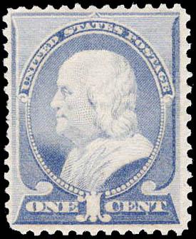 1887, 1¢ Franklin, ultramarine (Scott 212), o.g., never hinged, almost Very Fine. Scott $290. Estimate $100 - 150. (Image)