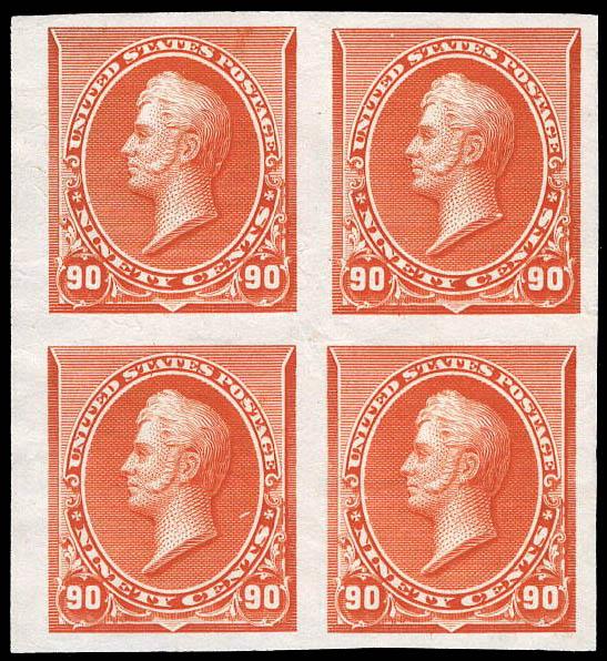 1890, 90¢ Perry, plate proof on India paper (Scott 229P3), block of 4, Extremely Fine. Scott $240. Estimate $75 - 100. (Image)