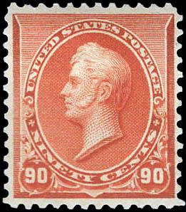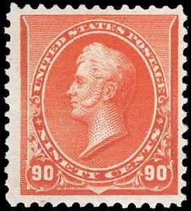 1890, 90¢ Perry, orange (Scott 229), bright rich color, o.g., hinged, Fine to Very Fine. Scott $475. Estimate $150 - 200. (Image)