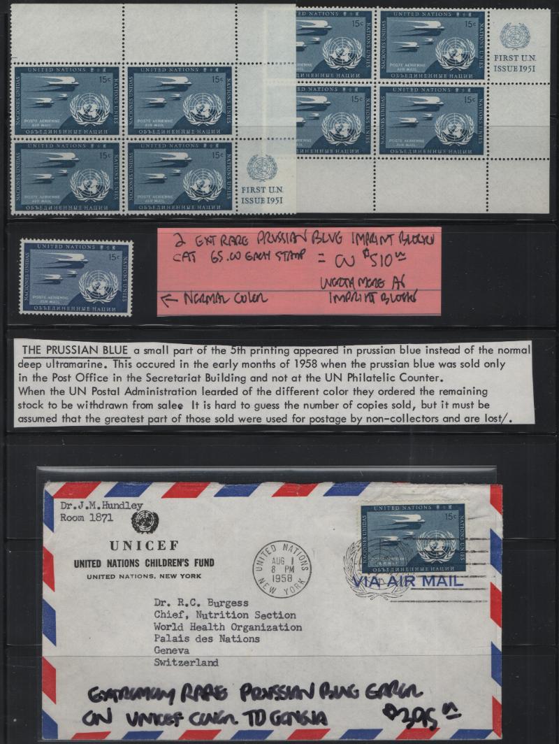 C3a ** NH VF Prussian Blue error incl (2) imprint Blks & one used on Aug 1958 UNICEF cover to Geneva (Image)