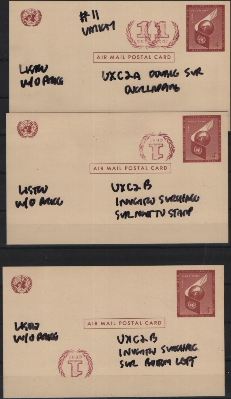 UXC2 unused VF (6) major error varieties incl (3) diff varieties UXC2a-double surcharges, (2) diff varieties UXC2b, (1) UXC2c double/inverted surcharges; collection was purchased in 1977 from A Terins (sheet incl); owner's retail $1,500 (NV) (Image)