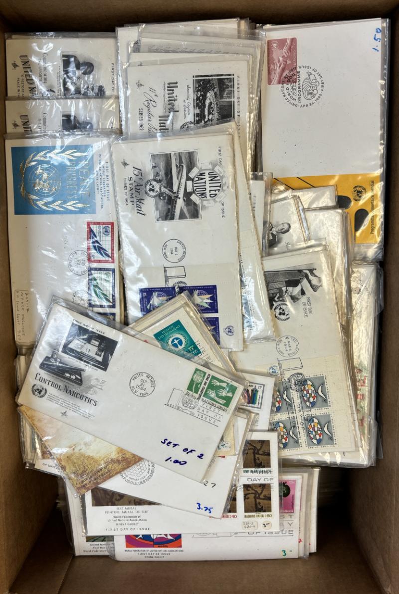 Accum abt (3500) FDC mainly NY w/ some Geneva & Vienna 1950s-90s, all appear cacheted & UA from UN Postal Admin & other cachet makers, loose & semi-organized, all sleeved & priced; light to moderate dup; some flap marks on earlies then F-VF (Image)