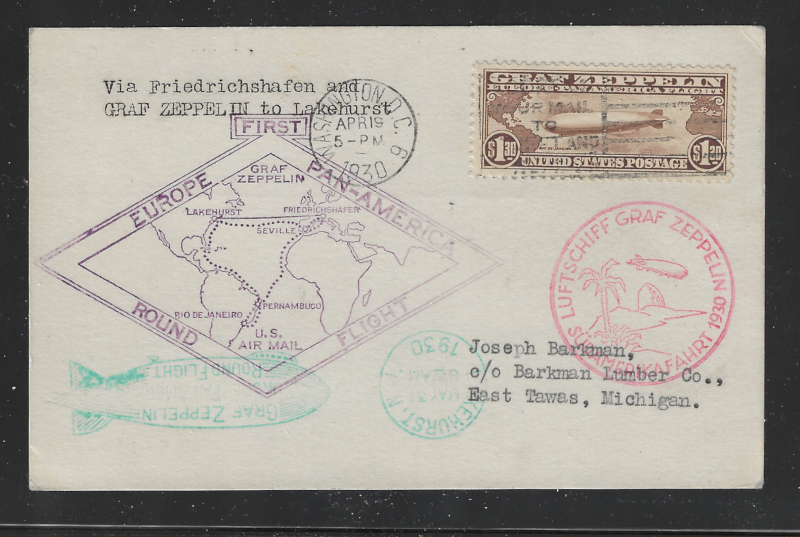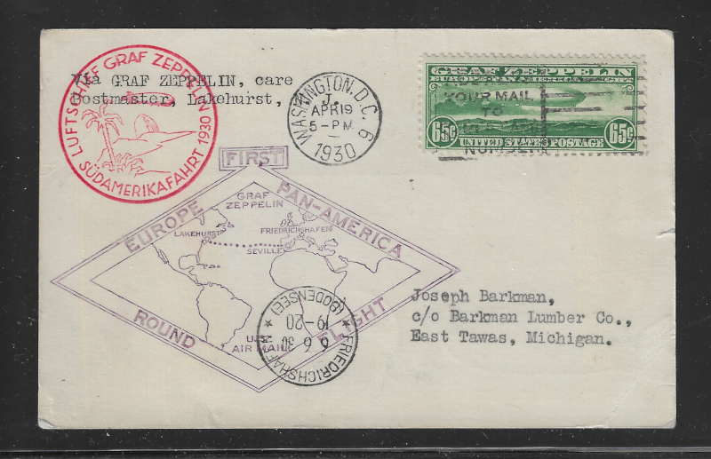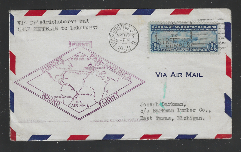 C15 "$2.60 Zeppelin", First Day Cover, April 19, 1930, Washington D.C. to East Tawas MI., With Appropriate Round Flight Cachet, Via Friedrichshafen, Back Stamped Lakehurst, N.J. (May 31, 1930), Sound Cond., VF, Cat. Value is $2,750.00 (Brookman) (Image)
