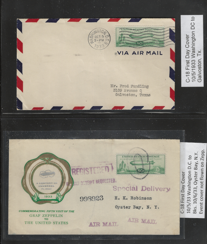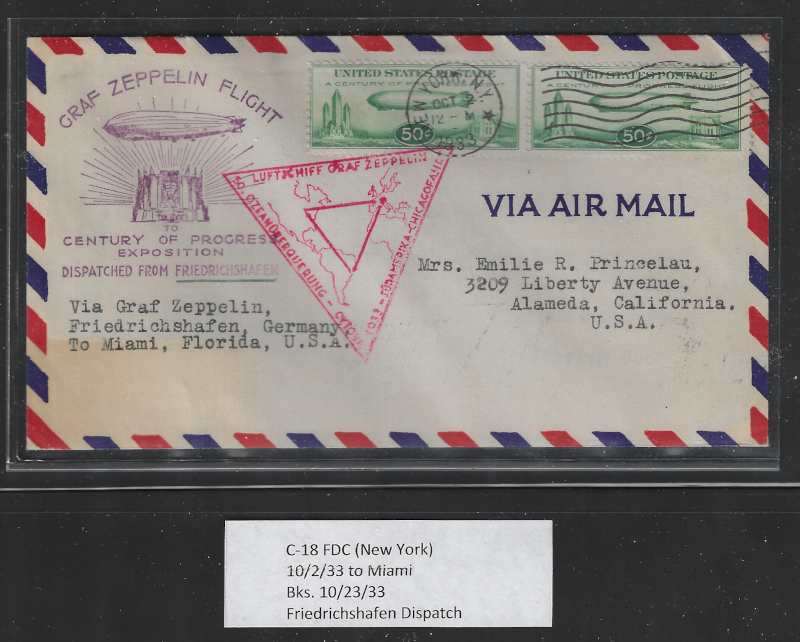C18 "50 c. Green", Pair on Cacheted F.D.C. (Oct. 2, 1933), Sent from New York to Alameda, CA, Flight Cover Via "Graf Zeppelin" from Friedrichshafen to Miami, FL., Light Toning, Otherwise Sound Cond., F-VF, Est. Cat Value $300.00 (Image)