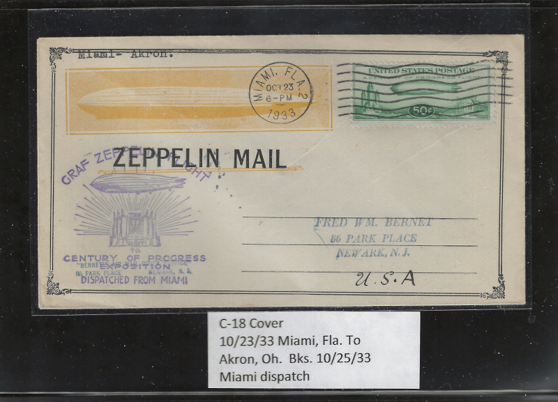 C18 "50 c. Green", on Flight Cover, Miami, FL (Oct. 23, 1933) to Akron, OH, Addr. to Newark, NJ., Envelope from "Bernet's Air Mail Cover Service", with "Zeppelin" Cachet, Plus "Century of Progress" Expo. Cachet, Sound Cond., VF, Cat. Value About $150.00 (Image)
