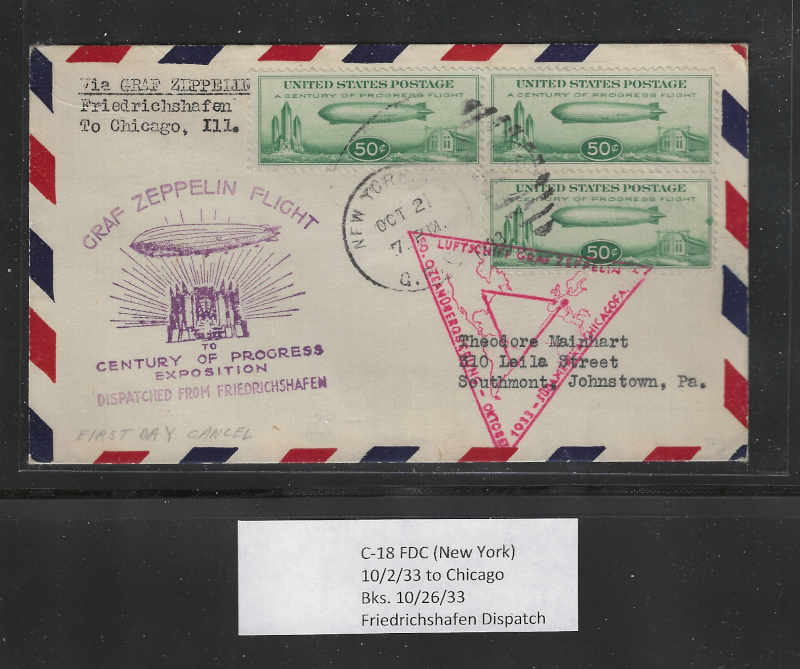 C18 "50 c. Green", 3 Stamps on Cacheted F.D.C., Sent from New York to Johnstown, PA. (Oct. 2, 1933), Flight Cover Via "Graf Zeppelin" from Friedrichshafen to Chicago, Includes Appropriate Cachets, With Oct. 26, 1933 Chicago Back Stamp, Sound Cond., VF, Est. Cat. Value $400.00 (Image)