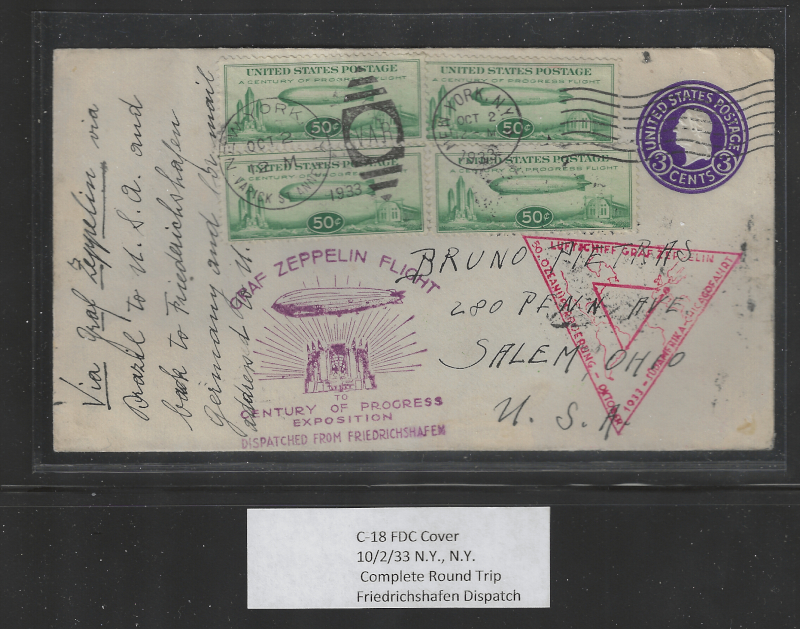 C18 "50 c. Green", 4 Stamps on Cacheted F.D.C., Oct. 2, 1933, Sent New York to Salem, Ohio, Flight Cover Via "Graf Zeppelin" Complete Round Trip, Friedrichshafen Dispatch, With Appropriate Cachets & Back Stamps (Including New York Nov. 18, 1933), Sound Cond., VF, Est. Cat. Value is $500.00 (Image)
