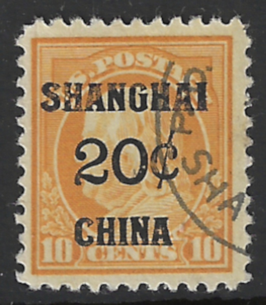 K10 "20 c. Shanghai" (1919 Issue), Used, Shanghai Cancel, Sound Cond., F-VF, SCV is $140.00 (Image)